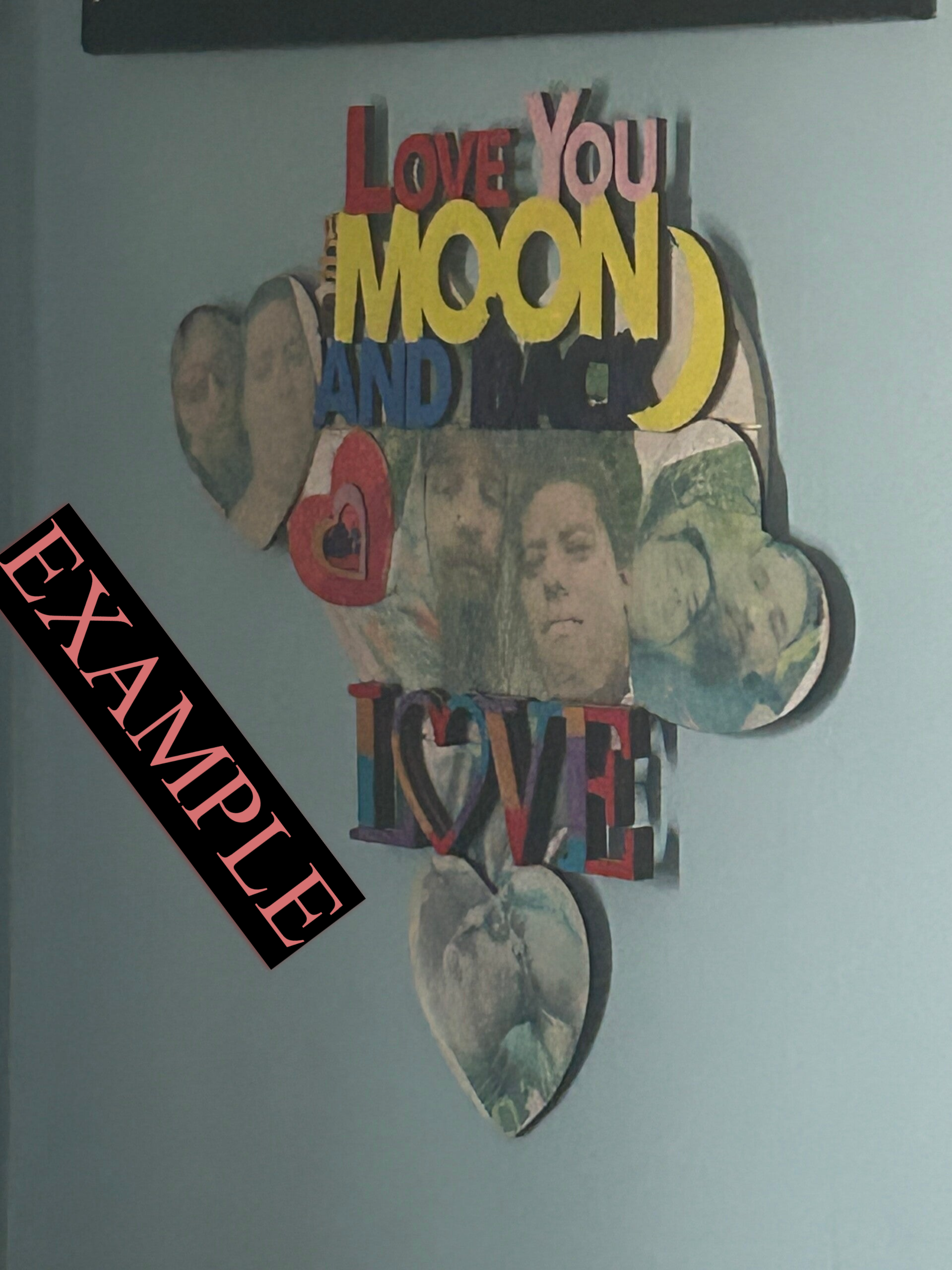 All wooden pieces come blank 3 small hearts, 1 huge heart, Love you to the moon and back , and love wooden words. Have any personal picture or any picure in general transfered onto large heart . Small heart have any picture, saying, nmes or dates you would like transfered or added. Words can be painted any color or shade would like i have multiple options and choices please feel free to discuss
